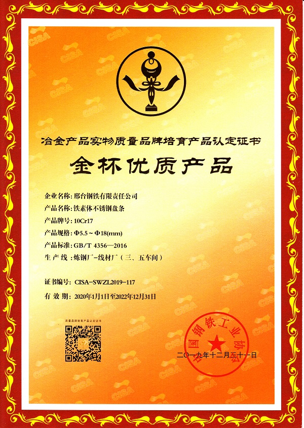 邢鋼鐵素體不銹鋼盤(pán)條10Cr17 φ5.5-18mm規(guī)格獲冶金產(chǎn)品實(shí)物質(zhì)量金杯優(yōu)質(zhì)產(chǎn)品認(rèn)定證書(shū)