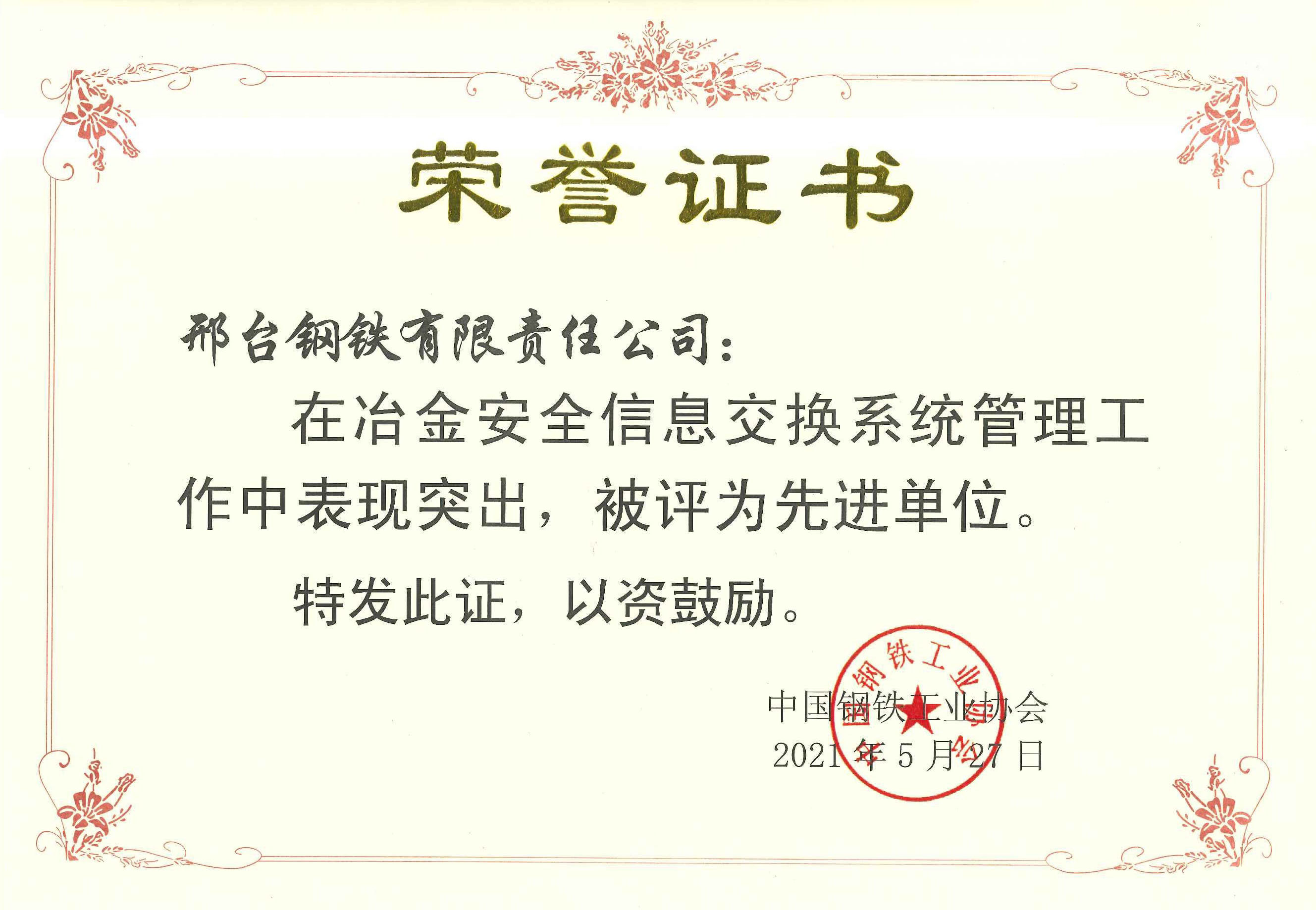 近日,邢臺鋼鐵有限責(zé)任公司(以下簡稱邢鋼)收到中鋼協(xié)〔2021〕73 號文《關(guān)于表彰冶金安全信息交換系統(tǒng)管理工作先進單位和先進個人的決定》及榮譽證書,邢鋼在冶金安全信息交換系統(tǒng)管理工作中表現(xiàn)突出,被評為先進單位。