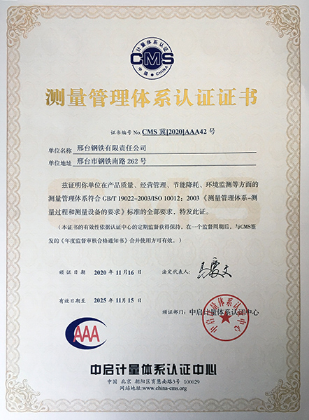近日,邢臺鋼鐵有限責(zé)任公司(以下簡稱邢鋼)收到中啟認(rèn)證中心頒發(fā)的《測量管理體系認(rèn)證證書》,證書編號CMS冀【2020】AAA42號,證書有效期至2025年11月15日,證書的獲得標(biāo)志著邢鋼測量體系認(rèn)證證書順利實現(xiàn)換版。
