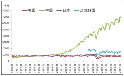 中國是鋼鐵生產(chǎn)大國,粗鋼產(chǎn)量在全球遙遙領(lǐng)先。自2002年開始中國開始進入經(jīng)濟飛速發(fā)展時期,粗鋼產(chǎn)量一直保持高速增長,到2013年粗鋼產(chǎn)量已達7.7億噸,約占全球產(chǎn)量的49.1%。美國,日本等鋼鐵生產(chǎn)大國,其對鋼鐵的需求已經(jīng)放緩,粗鋼產(chǎn)量一直保持穩(wěn)定狀態(tài),所以粗鋼產(chǎn)量的增長大部分來自于中國。(見圖1)