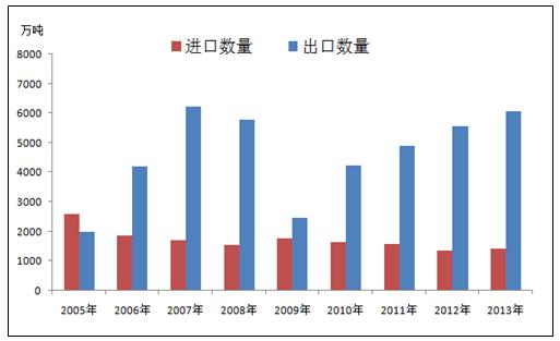 近幾年,中國鋼鐵的進口很穩(wěn)定波動不大,出口處于穩(wěn)健增長狀態(tài)。出口量增加的原因一是因為經(jīng)濟危機后各國經(jīng)濟都在緩慢復(fù)蘇中,主要經(jīng)濟體制造業(yè)景氣表現(xiàn)出現(xiàn)回升,2014年上半年全球制造業(yè)PMI指數(shù)平均值為52.58,達到了近兩年來相對高位的水平。另外新興經(jīng)濟體對國家基礎(chǔ)設(shè)施建設(shè)和民用建筑的投資不斷增大,對鋼材的需求明顯增加;二是中國鋼材價格相較于其他出口國較為低廉,且近期鋼價仍在不斷下跌,這增強了中國鋼材在國際貿(mào)易市場上的競爭力。2014年上半年,中國出口量為3930.37萬噸,同比增加1038.37萬噸,同比增幅為35.9%。(見圖2)