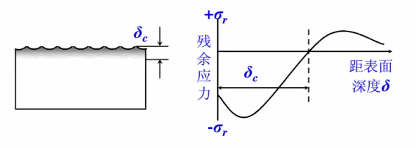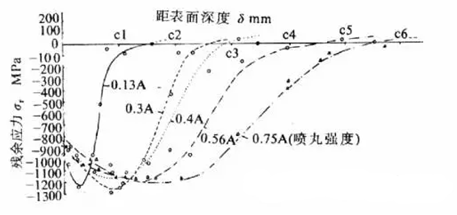 噴丸強化影響工件表面深度取決于工作自身強度,工件自身強度越高,影響深度越小。通常影響深度為0.1-0.8mm。下圖是高強鋼(σb=1900MPa)噴丸殘余應(yīng)力分布曲線,圖中可見噴丸強度由0.13Amm增高至0.75Amm,導致δc由0.15mm增至0.55mm,但表面殘余應(yīng)力和最大殘余應(yīng)力變化不明顯。