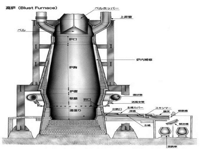 高爐是煉鐵設備,是鋼鐵冶煉的第一道工序,即鐵礦石須經(jīng)高爐冶煉后才能得到各種類用途的生鐵塊,或供煉鋼使用的鐵水。高爐外殼是鋼板,殼內(nèi)砌耐火磚內(nèi)襯,爐殼和耐火材料之間有冷卻設備。高爐本體自上而下分為爐喉、爐身、爐腰、爐腹、爐缸5個部分。