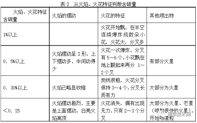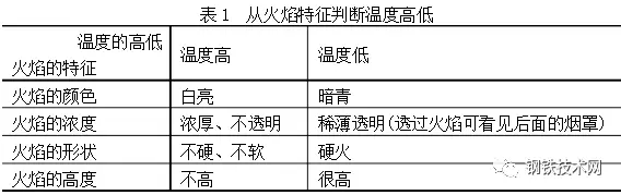 由上二表可見不能只憑一種“視覺信號”就判斷出爐內(nèi)的情況,而是根據(jù)多種信號綜合判斷爐內(nèi)情況,例如要從火焰的顏色、濃度、形狀、高度等來綜合判斷爐內(nèi)溫度情況。在判斷終點(diǎn)含碳量時(shí),既要看火花特征,還可考慮火焰形狀的變化。在收高碳時(shí)要看火焰擺動(dòng)的幅度,由大至小,在收低碳時(shí)要看火焰下降情況。