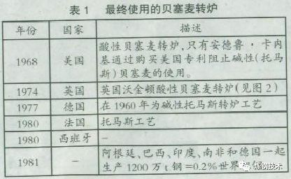 在世界的一些地區(qū)氧氣轉(zhuǎn)爐煉鋼和貝塞麥轉(zhuǎn)爐一直共存至1981年,但是在歐洲止于19世紀(jì)70年代,使用情況見表1。
