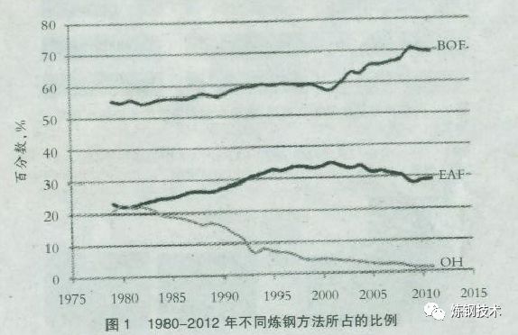 自此,氧氣轉(zhuǎn)爐煉鋼得到快速發(fā)展,而平爐煉鋼開始下降,如圖1所示。氧氣轉(zhuǎn)爐煉鋼發(fā)展超過平爐煉鋼的一個重要因素是連鑄技術(shù)的引進(jìn)。連鑄要求鋼水源源不斷供應(yīng),而氧氣轉(zhuǎn)爐的工藝時間比較短,能很容易地滿足連鑄的鋼水供應(yīng),一個大轉(zhuǎn)爐(350t)的產(chǎn)鋼速度為500t/h。與此相對照,如果平爐常規(guī)操作,煉鋼至出鋼需要12—14h,或者如果借助工業(yè)用氧加速也需要7—8h。目前在烏克蘭、俄羅斯和印度仍然存在一定數(shù)量的平爐冶煉。這些爐子正逐步被電弧爐取代,2012年平爐工藝總產(chǎn)鋼量1690萬t,約占全球鋼產(chǎn)量的1.1%。
