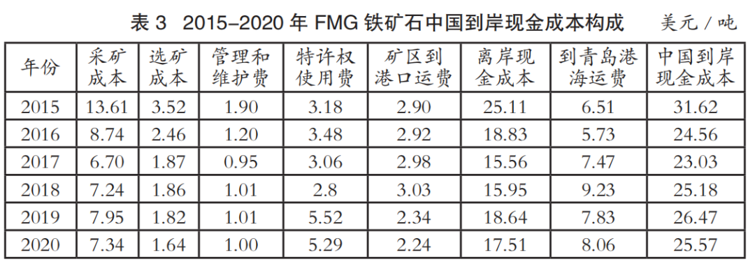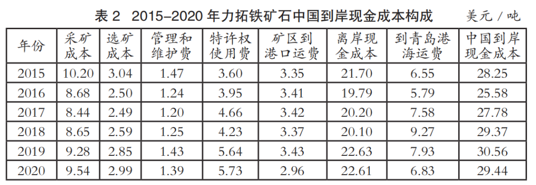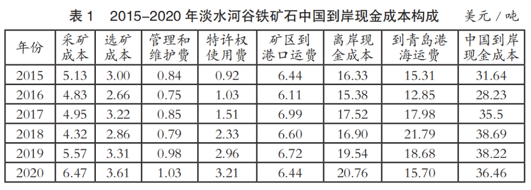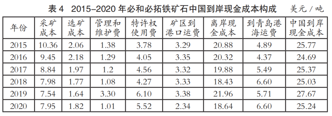 中國(guó)進(jìn)口鐵礦石到岸成本主要由離岸現(xiàn)金成本和海運(yùn)成本兩部分構(gòu)成。表1至表4為2015-2020年國(guó)際四大礦鐵礦石中國(guó)到岸現(xiàn)金成本構(gòu)成情況(數(shù)據(jù)來(lái)源:AME),其中離岸現(xiàn)金成本由采礦成本、選礦成本、管理和維護(hù)費(fèi)、特許權(quán)使用費(fèi)和礦區(qū)到港口運(yùn)費(fèi)構(gòu)成;中國(guó)到岸現(xiàn)金成本由離岸現(xiàn)金成本和到青島港海運(yùn)費(fèi)構(gòu)成;該成本數(shù)據(jù)僅為現(xiàn)金成本,不含國(guó)際四大礦的融資、折舊費(fèi)用。