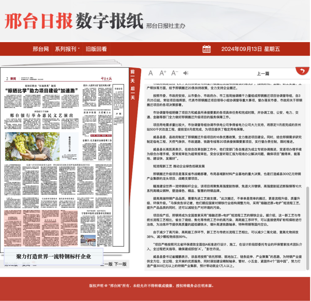 邢鋼搬遷升級項目是落實省市戰(zhàn)略部署,布局縣域新材料產(chǎn)業(yè)基地的重大決策,也是打造威縣300億元特鋼產(chǎn)業(yè)集群的龍頭項目、戰(zhàn)略支撐項目。 瞄準建設(shè)世界一流特鋼標桿企業(yè),該項目將聚焦高強度耐熱鋼、免退火冷鐓鋼、高強度耐延遲斷裂鋼等10大系列高精尖鋼種,塑造綠色、精品、智慧的特鋼品牌。