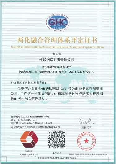 Brief Introduction: Recently, Xingtai Steel got the reassessment certificate of Integration of Information and Industrialization management systems. The validity period of the certificate is from December 14, 2020 to December 14, 2023. Xingtai Steel will take this as an opportunity to constantly c…