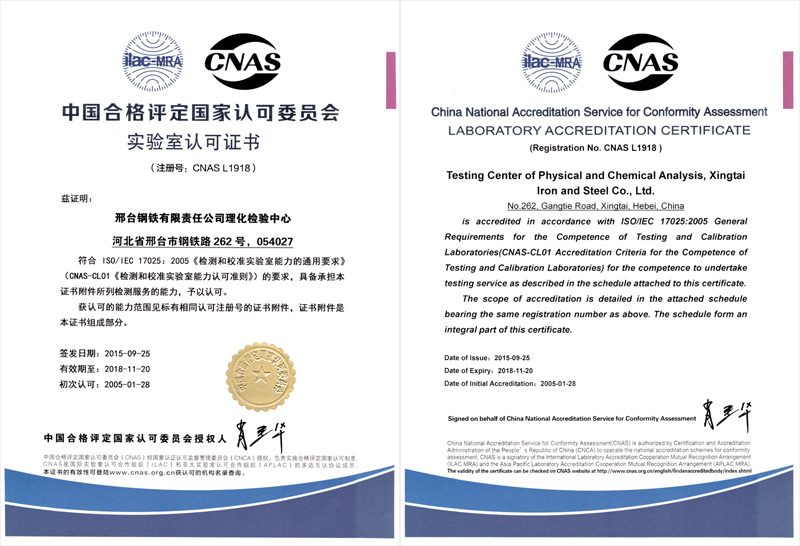 The physical and chemical inspection center of Xingtai Steel passed the third time review of CNAS successfully and obtained laboratory approval certificate in new version with registration number of CNASL1918 and expiry date of Nov.20th, 2018.