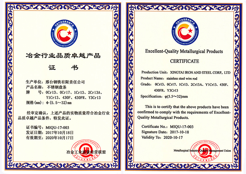 The φ5.5- 32mm wire rod of stainless steel 0Cr13, 0Cr17, 1Cr13, 2Cr13A, Y1Cr13, 430F, 430FR and Y3Cr13 (total 8products) was awarded Superior Quality Product in Metallurgical Industry.