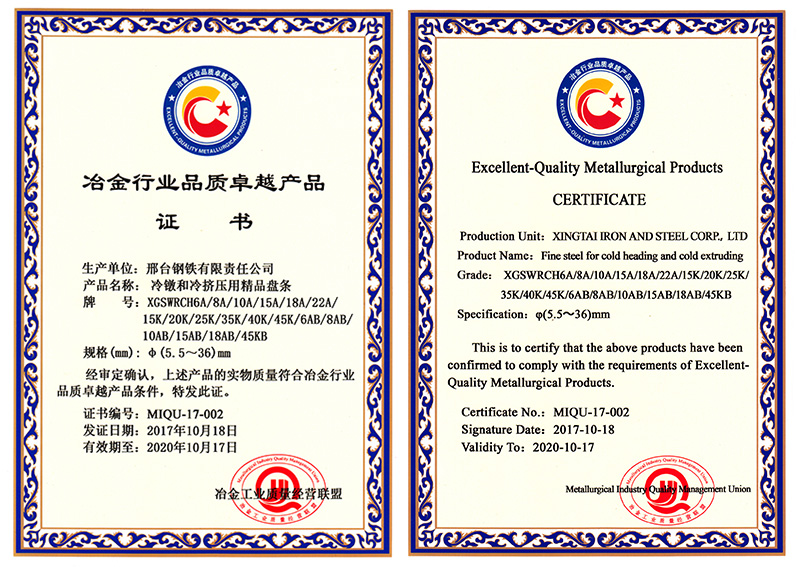 The φ5.5- 36mm high-quality wire rod for cold heading and cold extruding XGSWRCH6A/8A/10A/15A/18A/22A/15K/20K/25K/35K/40K/45K/6AB/8AB/10AB/15AB/18AB/45KB (total 18 products)was awarded Superior Quality Product in Metallurgical Industry.