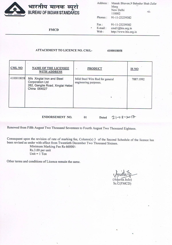 6 products of Xingtai Steel passed the BIS Certificate of India government