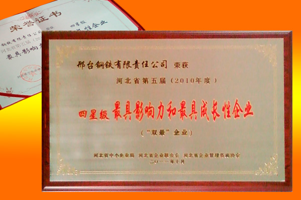 2011年10月,邢鋼榮獲“河北省第五屆(2010年度)四星級(jí)最具影響力和最具成長(zhǎng)性企業(yè)”。