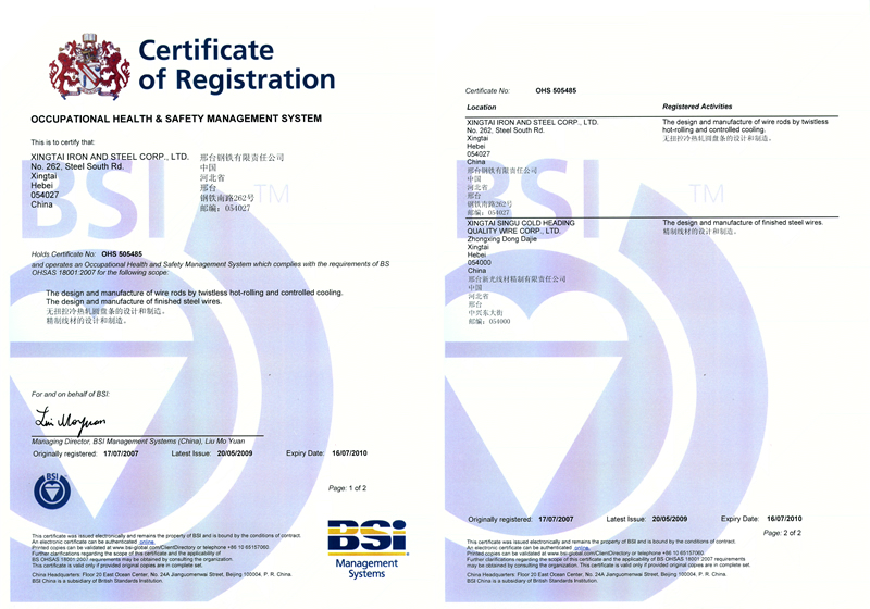 2007年7月17日,邢鋼獲OHSAS 18001:2007認(rèn)證證書(shū)(職業(yè)健康安全管理體系規(guī)范)。