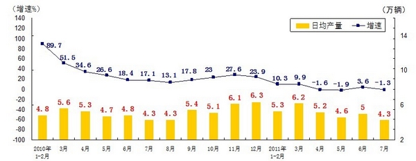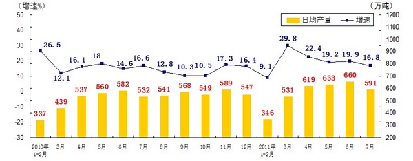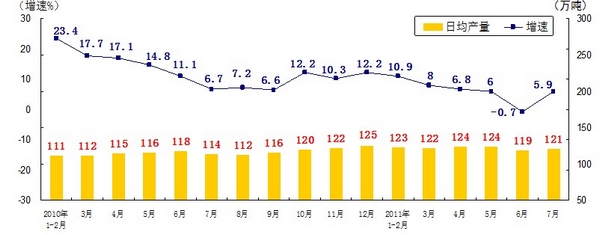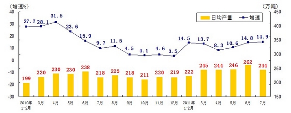 分產品看,7月份,468種產品中有381種產品同比增長。其中,發(fā)電量4252億千瓦時,日平均發(fā)電量137億千瓦時,增長13.2%;鋼材7572萬噸,日平均產量244萬噸,增長14.9%;水泥18308萬噸,日平均產量591萬噸,增長16.8%;原油加工量3749萬噸,日平均產量121萬噸,增長5.9%;十種有色金屬293萬噸,日平均產量9.5萬噸,增長9.8%;乙烯130萬噸,日平均產量4.2萬噸,增長11.5%;汽車131.8萬輛,日平均產量4.3萬輛,下降1.3%;轎車77.7萬輛,日平均產量2.5萬輛,增長12.6%。(參見附圖)