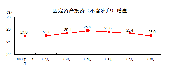 2011年1-8月份,固定資產(chǎn)投資(不含農(nóng)戶(hù))180608億元,同比增長(zhǎng)25%,比1-7月份回落0.4個(gè)百分點(diǎn)。其中,國(guó)有及國(guó)有控股投資62422億元,增長(zhǎng)12.1%。從環(huán)比看,8月份固定資產(chǎn)投資(不含農(nóng)戶(hù))增長(zhǎng)1.16%。