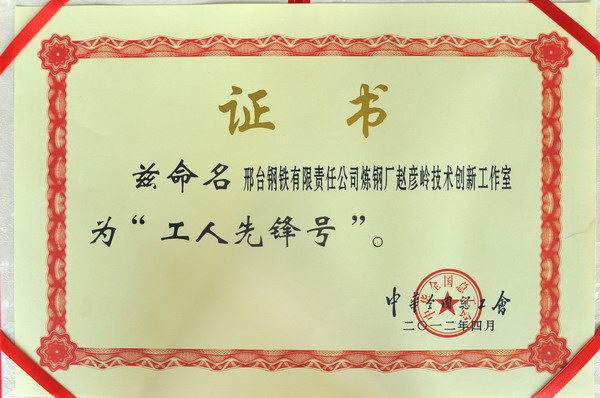 經(jīng)邢臺市總工會推薦,逐級申報,五一前夕,中華全國總工會命名邢臺鋼鐵有限責任公司煉鋼廠趙彥嶺技術(shù)創(chuàng)新工作室為國家級“工人先鋒號”。