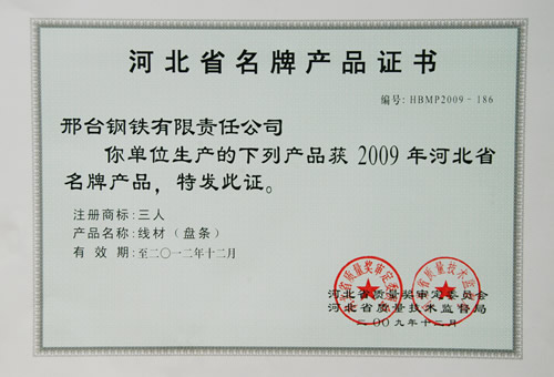 近日獲悉,2009年度邢鋼申報(bào)的“三人”牌線材產(chǎn)品,涵蓋冷墩鋼、簾線鋼、預(yù)應(yīng)力用鋼、優(yōu)質(zhì)碳素鋼、焊條用鋼、一般用低碳鋼、工業(yè)用純鐵、軸承鋼、彈簧鋼、機(jī)械結(jié)構(gòu)用鋼等十一個(gè)系列65個(gè)牌號(hào)線材產(chǎn)品榮獲“河北省名牌產(chǎn)品”。