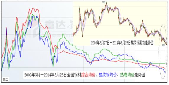 底線(xiàn)的提高,勢(shì)必助推中國(guó)經(jīng)濟(jì)大勢(shì)呈現(xiàn)前低后高的走勢(shì)。而經(jīng)過(guò)長(zhǎng)期低迷的中國(guó)鋼材市場(chǎng),也已經(jīng)具備逐漸走強(qiáng)的兩大要素:一是鋼市走強(qiáng)的外在環(huán)境趨好(見(jiàn)上圖一)。包括上半年推出一系列微刺激效應(yīng)逐漸顯現(xiàn),下半年由于經(jīng)濟(jì)增長(zhǎng)底線(xiàn)提高,以及持續(xù)加推的動(dòng)力措施等合成發(fā)酵,定會(huì)形成遠(yuǎn)比上半年良好的鋼市發(fā)展環(huán)境;二是鋼市走強(qiáng)的內(nèi)在動(dòng)能充沛(下圖二)。鋼材價(jià)格經(jīng)過(guò)長(zhǎng)期下跌后,已經(jīng)下穿了所有的技術(shù)阻力位,使業(yè)內(nèi)根本無(wú)法從技術(shù)面進(jìn)行詮釋。但從價(jià)值規(guī)律、市場(chǎng)規(guī)律以及基本面情況看,目前鋼材價(jià)格的底部特征已經(jīng)十分明顯,空方量能也已近衰竭。因此,經(jīng)過(guò)短時(shí)間的整固蓄勢(shì)后,震蕩上揚(yáng)應(yīng)該是后期運(yùn)行的主基調(diào)。如果再結(jié)合宏觀(guān)上經(jīng)濟(jì)增長(zhǎng)底線(xiàn)的提高,下半年鋼材價(jià)格恢復(fù)性上揚(yáng)既在情理之中,也是勢(shì)所必然。所以,基于經(jīng)濟(jì)和鋼市大勢(shì)筆者作出,下半年全國(guó)鋼材價(jià)格勢(shì)必高于上半年的預(yù)測(cè)。