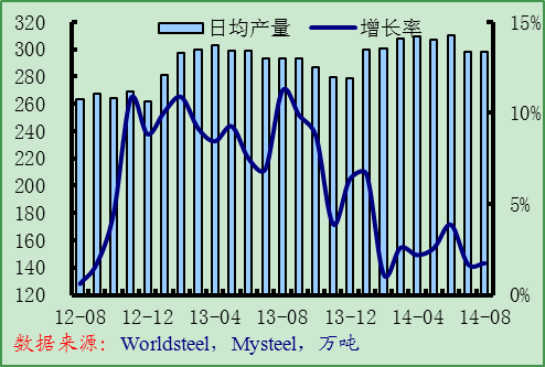 8月份亞洲粗鋼日均產(chǎn)量達到298.4噸,環(huán)比增長0.1%,同比增長1.7%,韓國和印度產(chǎn)量增長明顯。根據(jù)中鋼協(xié)的統(tǒng)計,9月份中國重點鋼企粗鋼日均產(chǎn)量環(huán)比小幅下降,而Mysteel調(diào)查的9月份全國鋼鐵PMI產(chǎn)出指數(shù)也有所下降。預(yù)計9月份亞洲粗鋼日均產(chǎn)量將環(huán)比下降。