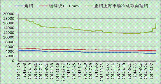 據(jù)鋼聯(lián)資訊跟蹤的部分電網(wǎng)建設(shè)用鋼價(jià)格走勢顯示,近3年來,由于鋼鐵產(chǎn)能的嚴(yán)重過剩以及下游投資建設(shè)需求的回落,鋼材價(jià)格一路持續(xù)下跌。其中用于變壓器的冷軋取向硅鋼價(jià)格從最高17800元/噸跌至13800元/噸,跌幅達(dá)22.5%,其中最低跌至11600元/噸。角鋼價(jià)格亦從最高4435元/噸跌至3094元/噸,鍍鋅板價(jià)格從最高5052元/噸下跌至4267元/噸,跌幅分別達(dá)30.2%和15.5%。從圖中可以看出,三個(gè)品種的價(jià)格在2012年跌幅相對較大。此后,價(jià)格逐步呈現(xiàn)陰跌的走勢,跌幅有所收窄,冷軋取向硅鋼價(jià)格在特高壓政策利好之下,率先小幅拉升,其他兩個(gè)品種鋼材因使用面廣,依舊維持震蕩走勢。