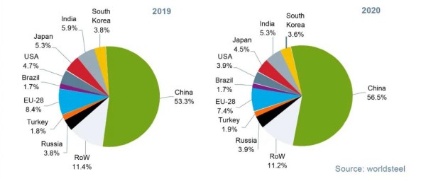 2020年,中國粗鋼產(chǎn)量達到10.53億噸,同比提高5.2%。中國粗鋼產(chǎn)量占全球粗鋼產(chǎn)量的份額,由2019年53.3%上升到2020年的56.5%。
