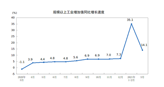 2021年3月份,規(guī)模以上工業(yè)增加值同比實際增長14.1 %(以下增加值增速均為扣除價格因素的實際增長率)。從環(huán)比看,3月份,規(guī)模以上工業(yè)增加值比上月增長0.60%。一季度,規(guī)模以上工業(yè)增加值同比增長24.5%;比2019年同期增長14.0%,兩年平均增長6.8%。