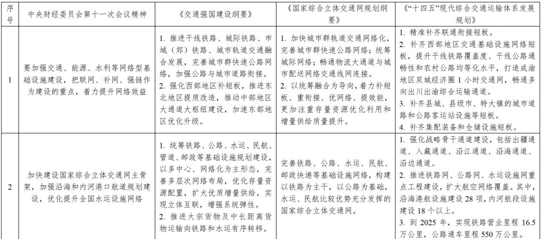 中央財(cái)經(jīng)委員會(huì)第十一次會(huì)議要求內(nèi)容與中共中央、國(guó)務(wù)院印發(fā)的《交通強(qiáng)國(guó)建設(shè)綱要》《國(guó)家綜合立體交通網(wǎng)規(guī)劃綱要》《“十四五”現(xiàn)代綜合交通運(yùn)輸體系發(fā)展規(guī)劃》等政策文件一脈相承,并有所側(cè)重,強(qiáng)化了交通、能源、水利、城鎮(zhèn)和科技等基礎(chǔ)設(shè)施在國(guó)內(nèi)國(guó)際雙循環(huán)相互促進(jìn)過程中的重要紐帶作用和產(chǎn)業(yè)鏈供應(yīng)鏈安全穩(wěn)定的保障基石作用,對(duì)構(gòu)建現(xiàn)代化基礎(chǔ)設(shè)施體系、推動(dòng)經(jīng)濟(jì)高質(zhì)量發(fā)展具有重要指導(dǎo)意義。同時(shí),兼顧了有序推進(jìn)地下綜合管廊建設(shè),加強(qiáng)城市防洪排澇、污水和垃圾收集處理體系建設(shè),加強(qiáng)防災(zāi)減災(zāi)基礎(chǔ)設(shè)施、公共衛(wèi)生應(yīng)急設(shè)施和國(guó)家安全基礎(chǔ)設(shè)施建設(shè);推進(jìn)重點(diǎn)水源、灌區(qū)、蓄滯洪區(qū)建設(shè)和現(xiàn)代化改造等內(nèi)容。表1為中央財(cái)經(jīng)委員會(huì)第十一次會(huì)議基礎(chǔ)設(shè)施建設(shè)有關(guān)內(nèi)容與相關(guān)政策文件對(duì)照。