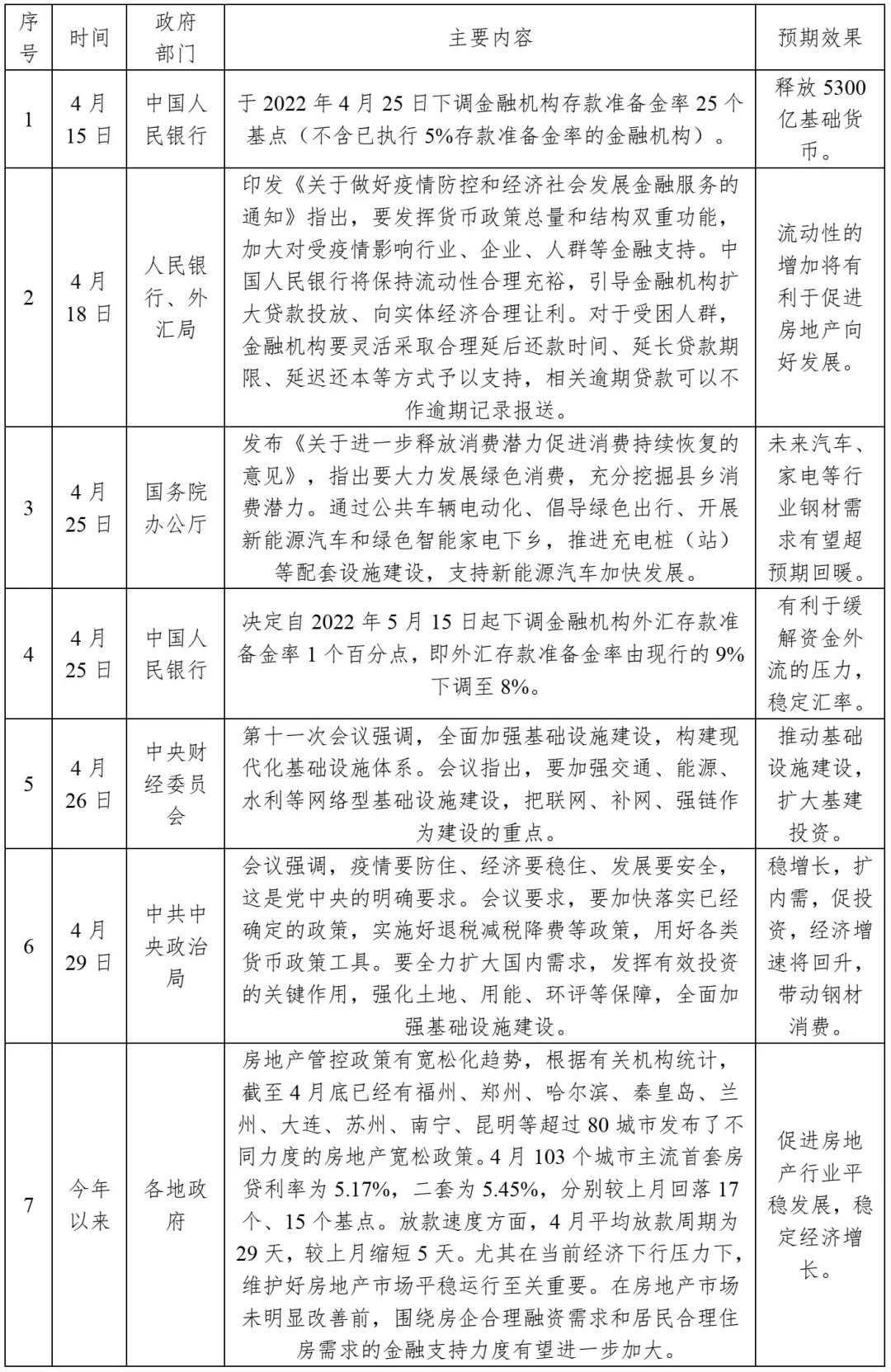 二是資金流動(dòng)性充足,有力支撐投資增長(zhǎng)和鋼材需求。4月15日中國(guó)人民銀行下調(diào)金融機(jī)構(gòu)存款準(zhǔn)備金率25個(gè)基點(diǎn)釋放約5300億基礎(chǔ)貨幣。2022年擬安排地方政府專項(xiàng)債券3.65萬億元,其中一季度專項(xiàng)債發(fā)行規(guī)模約為1.46萬億元,占全年的40%,幾乎是去年同期的4倍,預(yù)計(jì)大部分新增專項(xiàng)債將發(fā)行前移,今年專項(xiàng)債將重點(diǎn)用于交通基礎(chǔ)設(shè)施、能源、農(nóng)林水利、生態(tài)環(huán)保等方向;同時(shí),2021年四季度1.2萬億專項(xiàng)債也將在今年一季度逐漸轉(zhuǎn)化為實(shí)物工作量。此外,一季度新增人民幣貸款8.34萬億元,比上年同期多增了6636億元。4月1日至28日,已有約6250億元留抵退稅款退到企業(yè)賬戶,完成全年計(jì)劃留抵退稅款的41.7%左右;5月將提前退還小型和中型企業(yè)存量留抵稅額,此后還將加快大型企業(yè)退稅進(jìn)度。隨著資金流動(dòng)性的改善和資金進(jìn)一步到位,基礎(chǔ)設(shè)施建設(shè)等行業(yè)投資力度將進(jìn)一步加大,固定投資增速有望持續(xù)攀升,進(jìn)而拉動(dòng)鋼鐵消費(fèi)進(jìn)一步釋放。