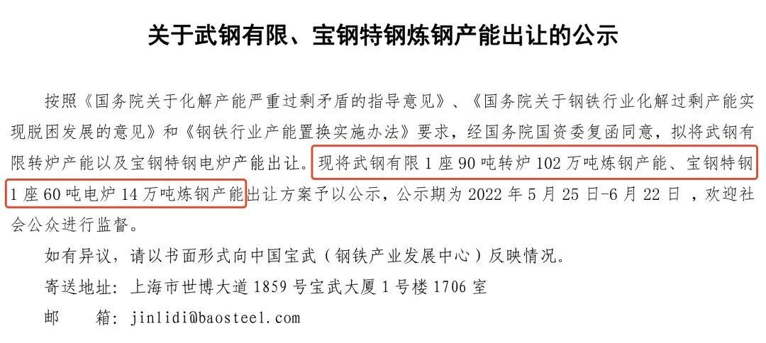 按照《國務(wù)院關(guān)于化解產(chǎn)能嚴重過剩矛盾的指導意見》、《國務(wù)院關(guān)于鋼鐵行業(yè)化解過剩產(chǎn)能實現(xiàn)脫困發(fā)展的意見》和《鋼鐵行業(yè)產(chǎn)能置換實施辦法》要求,經(jīng)國務(wù)院國資委復(fù)函同意,擬將武鋼有限轉(zhuǎn)爐產(chǎn)能以及寶鋼特鋼電爐產(chǎn)能出讓?,F(xiàn)將武鋼有限1座90噸轉(zhuǎn)爐102萬噸煉鋼產(chǎn)能、寶鋼特鋼1座60噸電爐14萬噸煉鋼產(chǎn)能出讓方案予以公示,公示期為2022年5月25日-6月22日,歡迎社會公眾進行監(jiān)督。