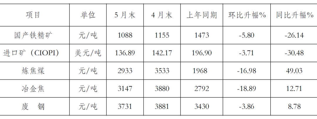 5月末,CIOPI進口礦價格環(huán)比下降5.28美元/噸,國產鐵精礦價格環(huán)比下降67元/噸;煉焦煤價格環(huán)比下降600元/噸,冶金焦價格環(huán)比下降733元/噸,廢鋼價格環(huán)比下降150元/噸。原燃料價格雖環(huán)比回落,但總體仍處于高位。(見下表)