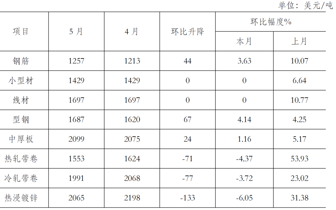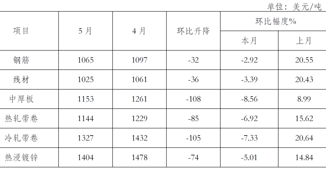 5月份,鋼鐵產量持續(xù)環(huán)比增長。吉林,上海等疫情嚴重地區(qū)開始復工復產、國家穩(wěn)增長政策相繼出臺,對需求的拉動還不明顯,國內市場鋼材需求增長不及預期,加上鋼鐵生產環(huán)比增長,以及原燃材料價格在前期大漲后有所回落,致使鋼材價格呈小幅下行走勢。