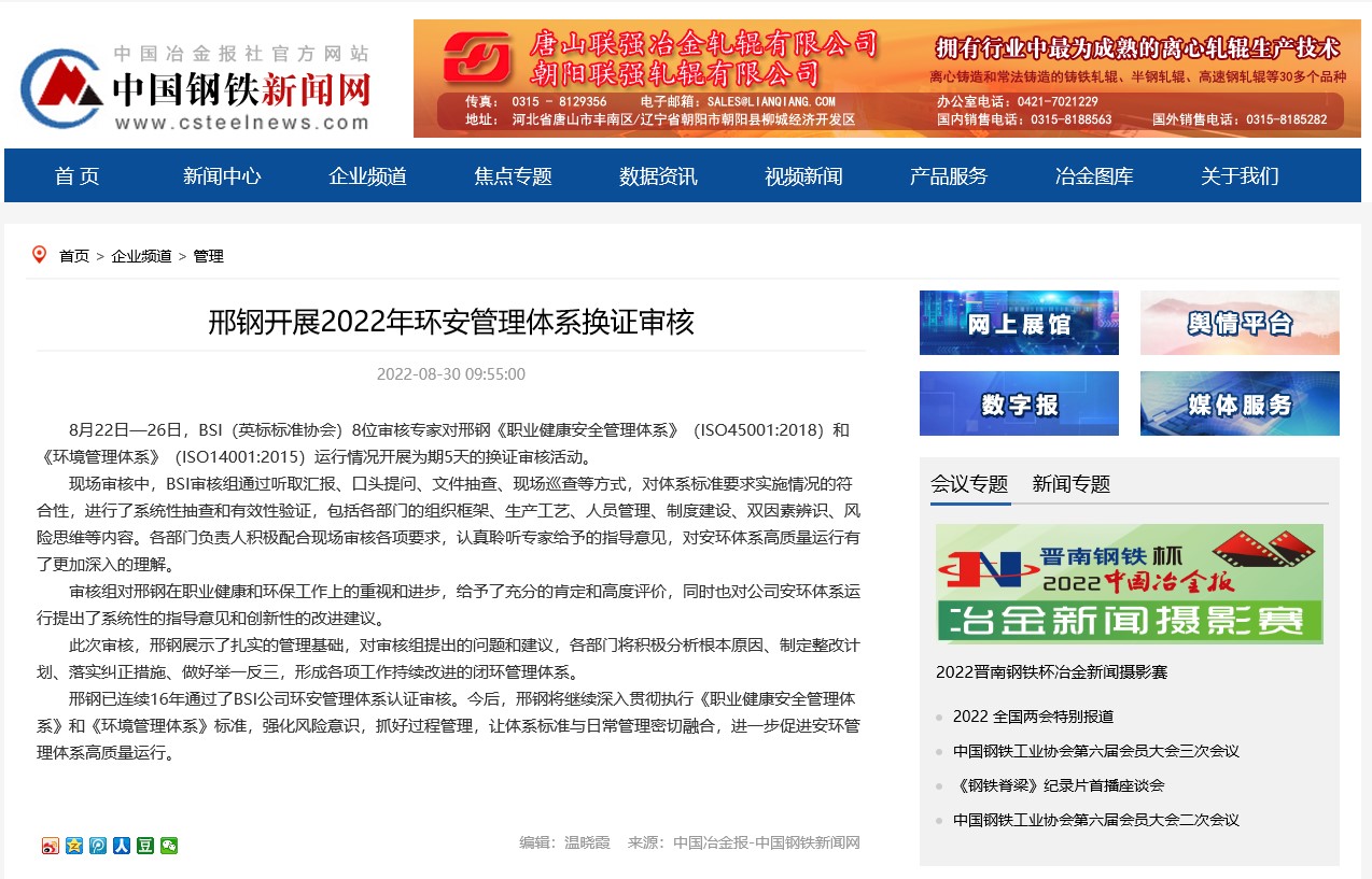 邢鋼開展2022年環(huán)安管理體系換證審核