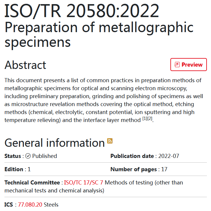 ISO/TR 20580:2022 Preparation of metallographic specimens《金相試樣的制備》國際標(biāo)準(zhǔn)近日批準(zhǔn)發(fā)布,這是由我國主導(dǎo)制定的又一項(xiàng)金相檢驗(yàn)領(lǐng)域國際標(biāo)準(zhǔn)。