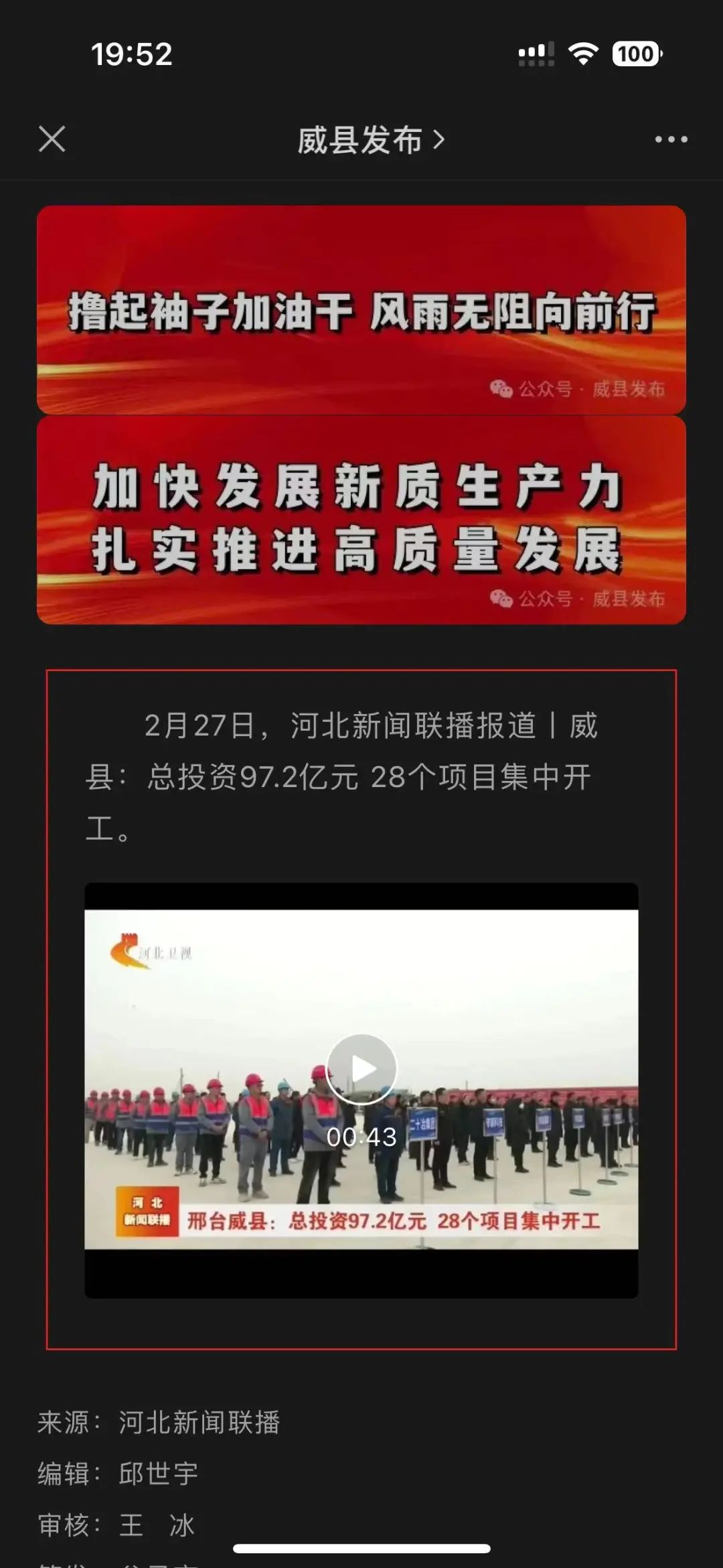 去年以來,威縣錨定抓招商、上項目、優(yōu)環(huán)境,成功引進了一批大好高優(yōu)項目,有力推動了縣域經(jīng)濟穩(wěn)健高質量發(fā)展。去年簽約項目87個、總投資120億元,引進央企子公司6家,邢鋼搬遷項目開工建設、吉利新能源商用車整車下線、春立正達醫(yī)療器械等重大項目投產(chǎn),高新區(qū)成功擴區(qū),新增可利用土地1.3萬畝,縣域科技創(chuàng)新能力評價躍升為全省A類。