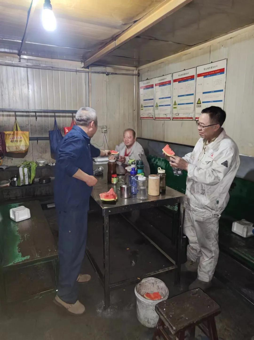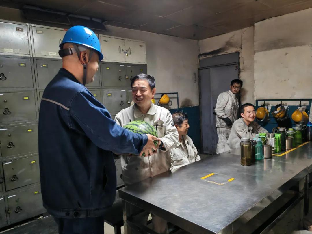 “天氣炎熱,大家辛苦了”,在爐前,侯副總親自把西瓜送到員工手里,并送上節(jié)日的祝福“端午安康!”希望大家在工作中注意做好防暑降溫,避免中暑,工作中合理分配體力,既要保證西場(chǎng)主溝澆筑過(guò)程安全,又要保證東場(chǎng)單場(chǎng)出鐵過(guò)程安全。在二燒混合機(jī)檢修現(xiàn)場(chǎng),侯總了解檢修進(jìn)度,叮囑維修、燒結(jié)車(chē)間主任,要注意檢修過(guò)程人員安全,保證檢修質(zhì)量,為二燒設(shè)備穩(wěn)定運(yùn)行奠定基礎(chǔ)。