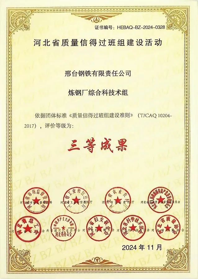 技術(shù)組成員以嚴(yán)謹(jǐn)?shù)膽B(tài)度、高度的責(zé)任感為公司產(chǎn)量質(zhì)量發(fā)展做出積極貢獻,在河北省質(zhì)量協(xié)會等部門組織的質(zhì)量信得過班組建設(shè)活動評比中,煉鋼廠綜合科技術(shù)組獲評河北省質(zhì)量信得過班組建設(shè)活動三等成果。