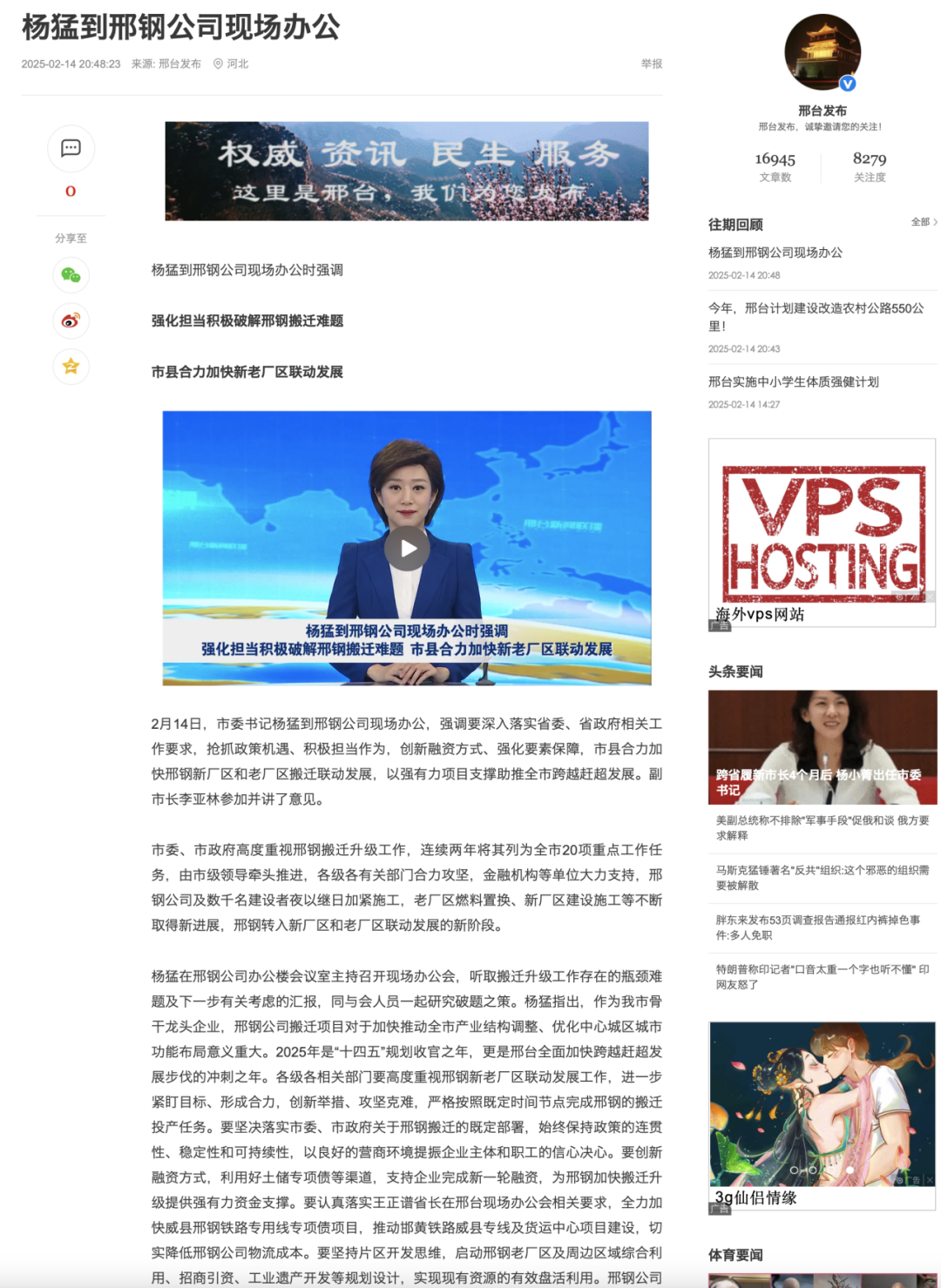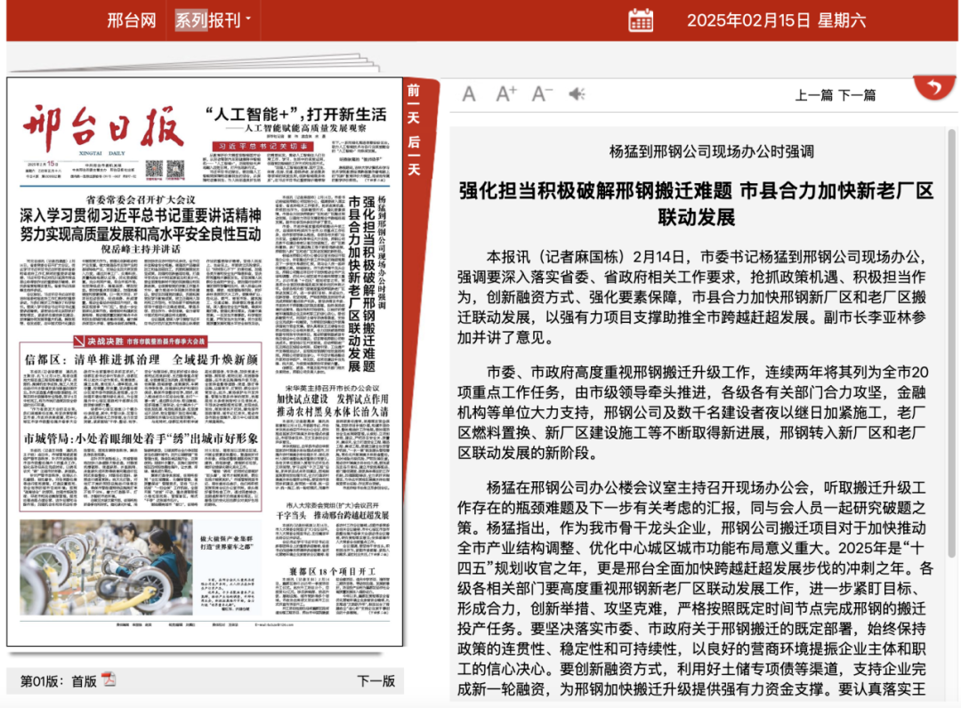 2月14日,市委書記楊猛到邢鋼公司現(xiàn)場辦公,強(qiáng)調(diào)要深入落實省委、省政府相關(guān)工作要求,搶抓政策機(jī)遇、積極擔(dān)當(dāng)作為,創(chuàng)新融資方式、強(qiáng)化要素保障,市縣合力加快邢鋼新廠區(qū)和老廠區(qū)搬遷聯(lián)動發(fā)展,以強(qiáng)有力項目支撐助推全市跨越趕超發(fā)展。副市長李亞林參加并講了意見。